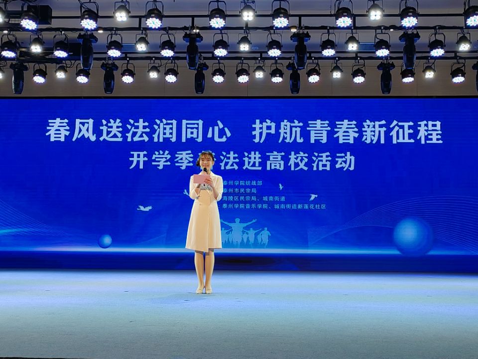 为深入贯彻落实党的宗教工作方针政策,筑牢校园反邪防渗防线。3月18日下午,泰州市、海陵区两级民宗局联合泰州学院、海陵区城南街道,共同举办“春风送法润同心,护航青春新征程”普法进高校活动。泰州市民宗局副局长朱燕萍、泰州学院统战部副部长张学茂、海陵区委统战部副部长张小军等出席活动。